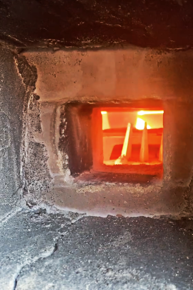 Das Feuer entzieht dem Ofen Sauerstoff, wodurch eine sogenannte Reduktion entsteht. Diese besondere Atmosphäre lässt Glasuren anders reagieren als im Elektroofen, was zu einzigartigen Farben und Oberflächen führt. Zusätzlich sorgt die Asche, die während des Brennens auf die Keramik fällt, zusammen mit der direkten Flammeneinwirkung für beeindruckende und natürliche Glasureffekte, die jedes Stück zu einem Unikat machen.